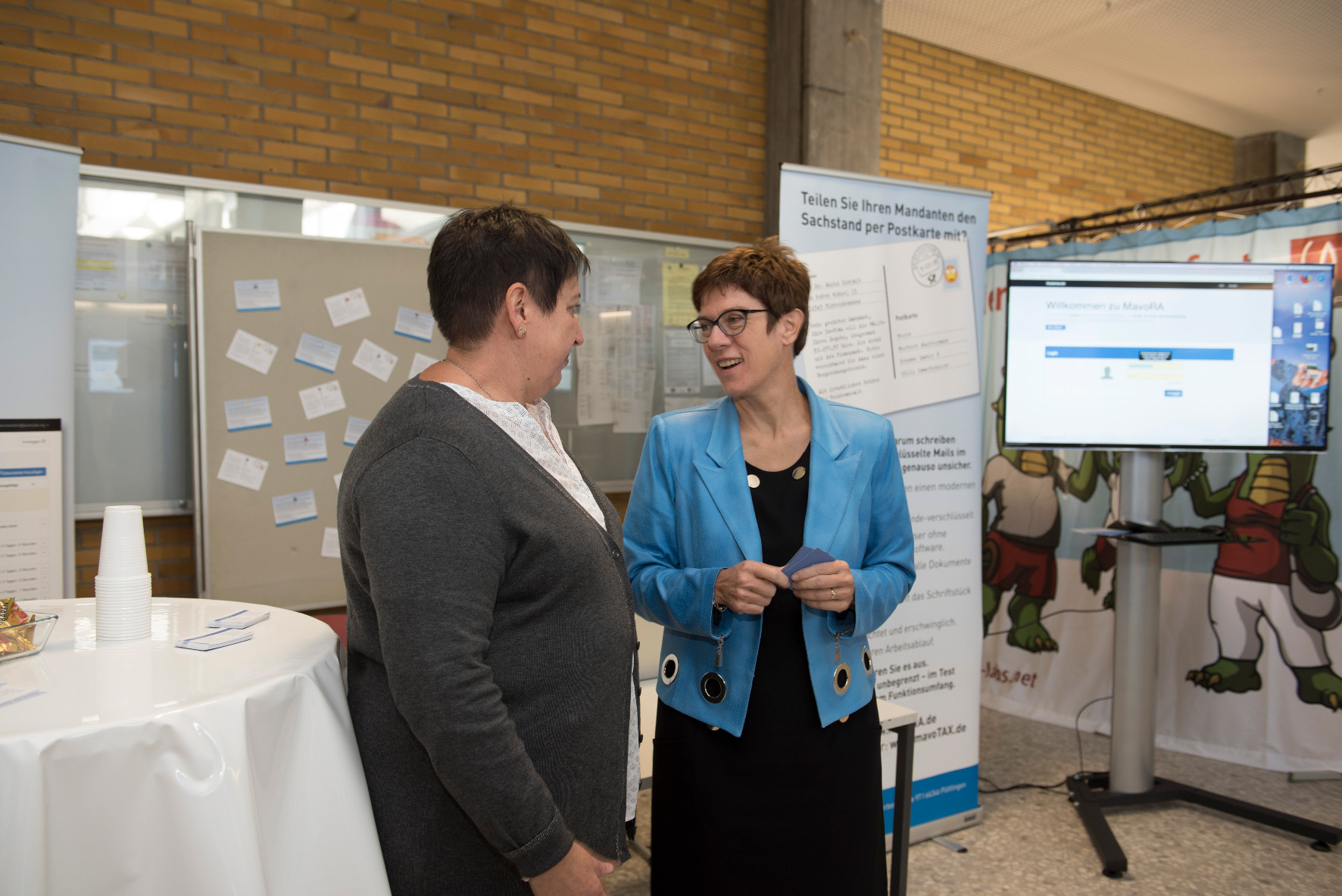 Die saarländische Ministerpräsidentin Annegret Kramp-Karrenbauer (rechts) informiert sich bei Bärbel Ruffing (links) über MavoRA. (Foto: © EDV-GT)