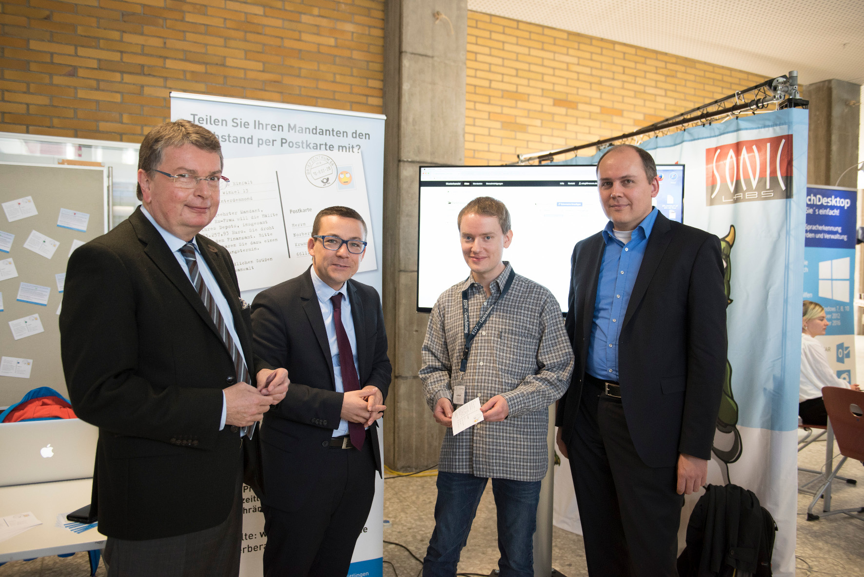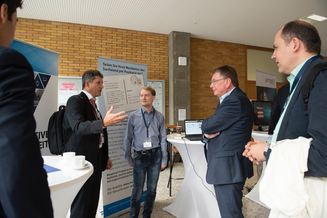 Auch der Justiz-Staatssekretär des Saarlandes Roland Theis (2. von links) interessierte sich für unsere Software (Gesellschafter der SOLE Software GmbH v.l.n.r.: Prof. Dr. Stephan Ory, Geschäftsführer Dominik Leibenger, Prof. Dr. Christoph Sorge). (Foto: © EDV-GT)Auch auf Twitter